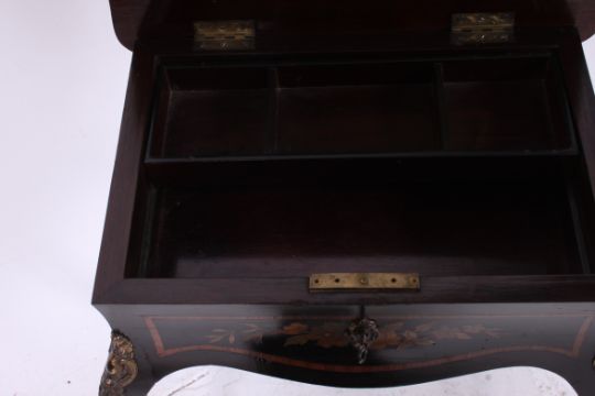 A 19th century Victorian marquetry inlaid continental cabinet with lifting lid and ormolu mounts to the sabre supports having marquetry inlaid shaped frieze