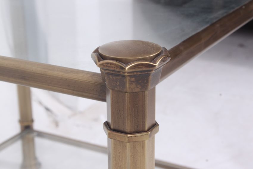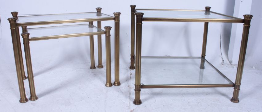 A good quality 20th century brass and glass nest of tables. The tables with glass inserts having brass tubular columns to side. H52cm x W63cm x D63cm