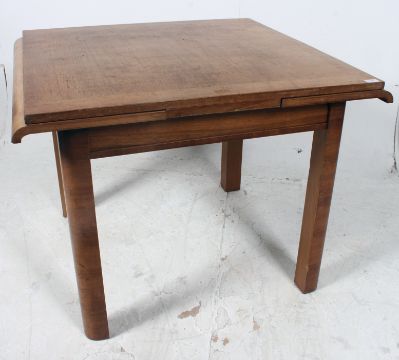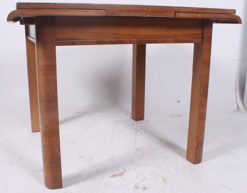A 1930's Art Deco walnut refectory draw leaf extending dining table. Raised on squared supports having chamfered corners with extending top over the fitted frieze frame. H75cm x W91cm x D97cm