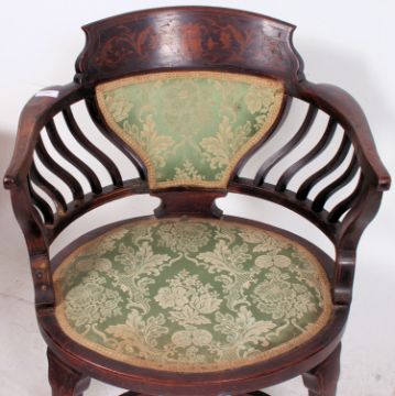 An Edwardian mahogany marquetry inlaid salon armchair. Raised on squared legs with padded seat, railed back rest with marquetry inlaid top rail