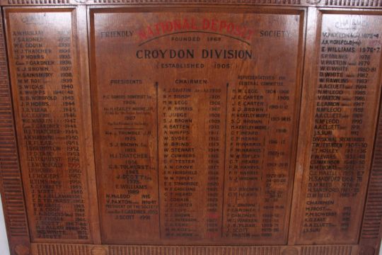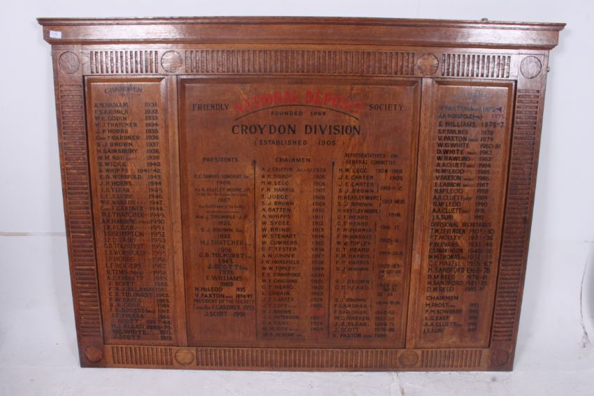A retro 20th century Croydon National Co-Op Division oak honours board of large form with details painted by hand. H46cm x D16cm