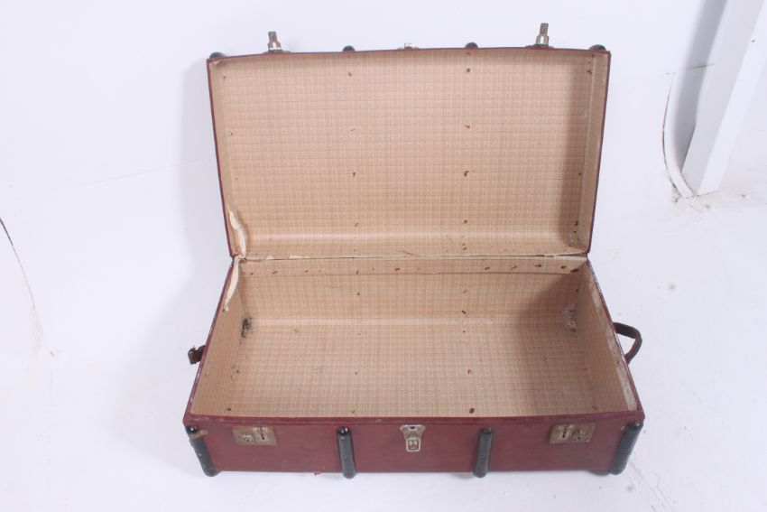 A vintage 20th century retro canvas and wooden strap steamer trunk. 32 x 92 x 52