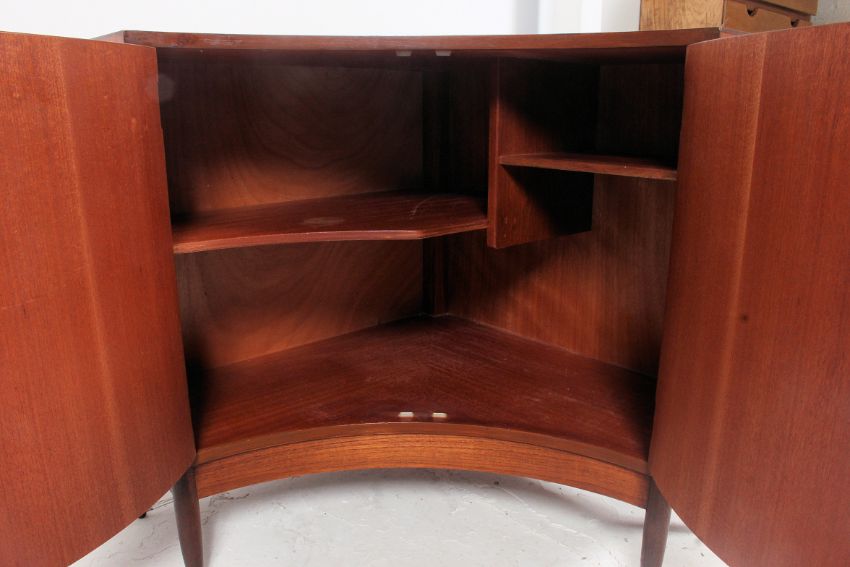 A good 1960's Danish teak corner cabinet. Raised on tapered legs with twin doors having shelved interior within. H75cm x W74cm x D74cm
