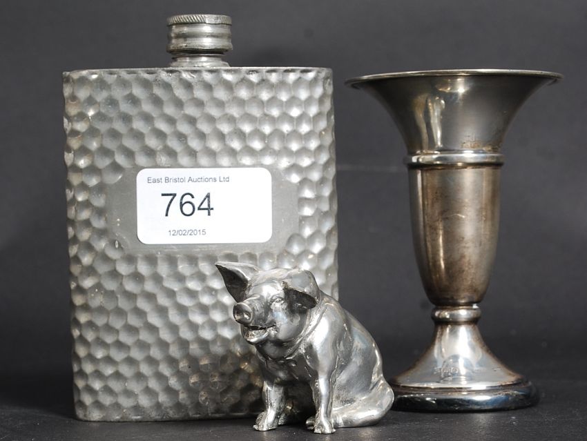 A silver Birmingham 1906 hallmarked miniature vase weighing 67.2g, measures 10cms high together with a pewter hipflask and pig