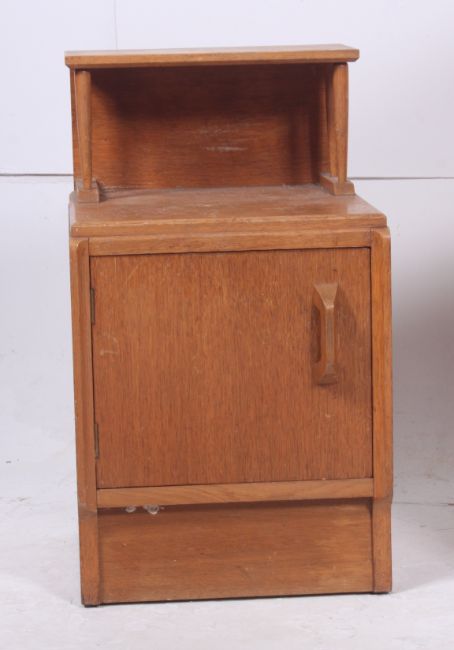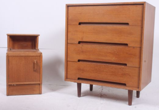 A retro oak chest of drawers having a set of 4 drawers with pierced handles raised on turned legs. Together with a side cabinet. H92cm x W76cm x D46cm