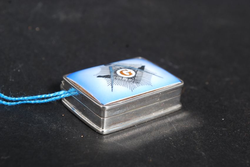 A 20th century white metal (stamped 925 for silver ) masonic and enamel pill box.