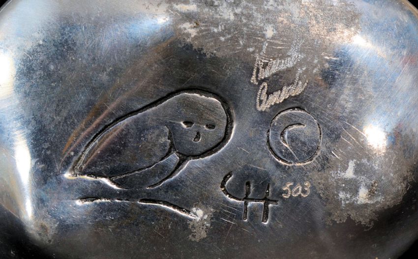 An Inuit white metal tall goose being marked to the base 114 Hosetton, Canada. Together with a owl pin dish signed to base with numbers 503