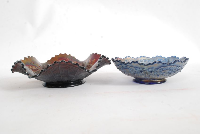 An early 20th century Northwood carnival glass bon bon dish with pear and peach design bearing Northwood mark to centre. Together with a cobalt blue carnival glass dish with fruit decoration