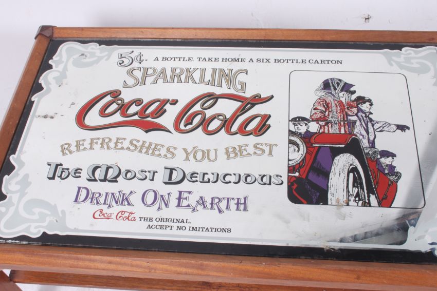 A 1970's retro teak and mirror advertising glass coffee table. The old mirror top advertising coca-cola. Raised on angled squared supports with lower tier. H40cm x W100cm x D60cm