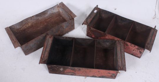 A collection of 3 vintage early 20th century Industrial sheet metal tote trays ex Douglas Motorcycle Factory, Bristol. H22cm x W69cm x D21cm