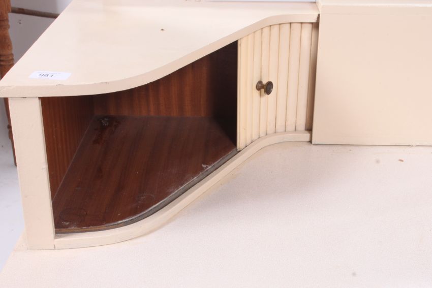 A retro 1950's post war shabby chic painted dressing table. Raised on angled supports with a series of drawers, drop centre top having mirror above. H131cm x 107cm x 50cm