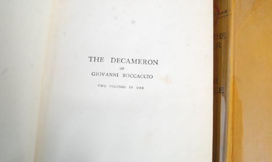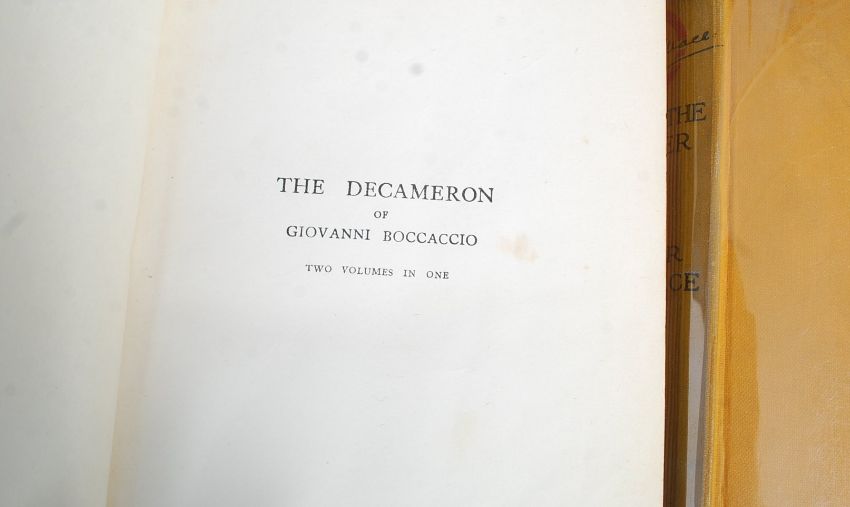 Rafael Sabatini. Scaramouche. Hutchinson & Co , London. Petol blue boards with gilt notation. Together with The Decameron of Giovanni Boccaccio Rigg's faithful and complete translation with the Original 16 Plates by Louis Chalon, Red Hard/cover with gold decors and lettering. Also, Edgar Wallace, Again The Ringer 140, Hodder & Stoughton, yellow boards with notation.