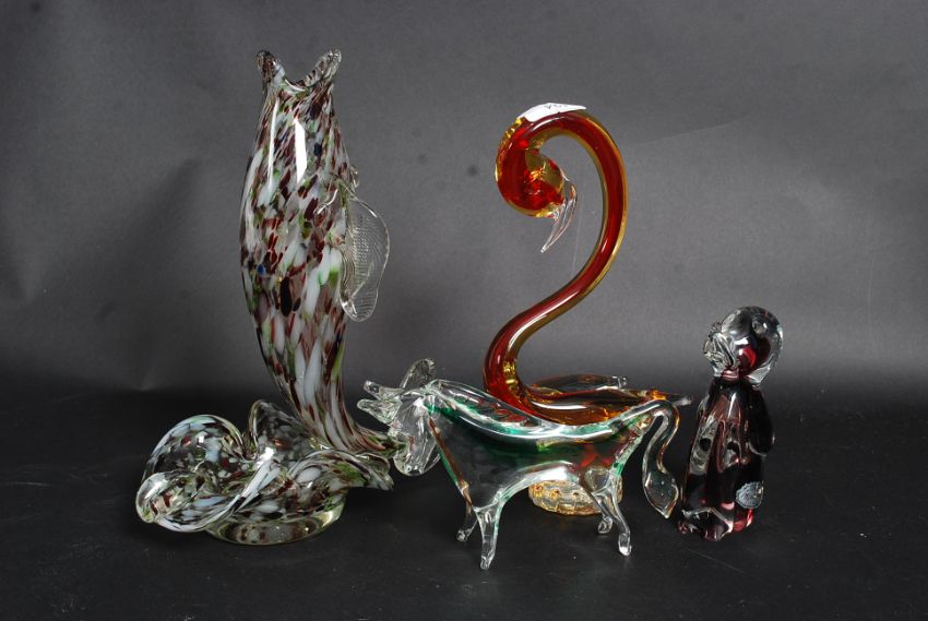 A collection of 20th century studio art glass by Murano to also include a fish ashtray.