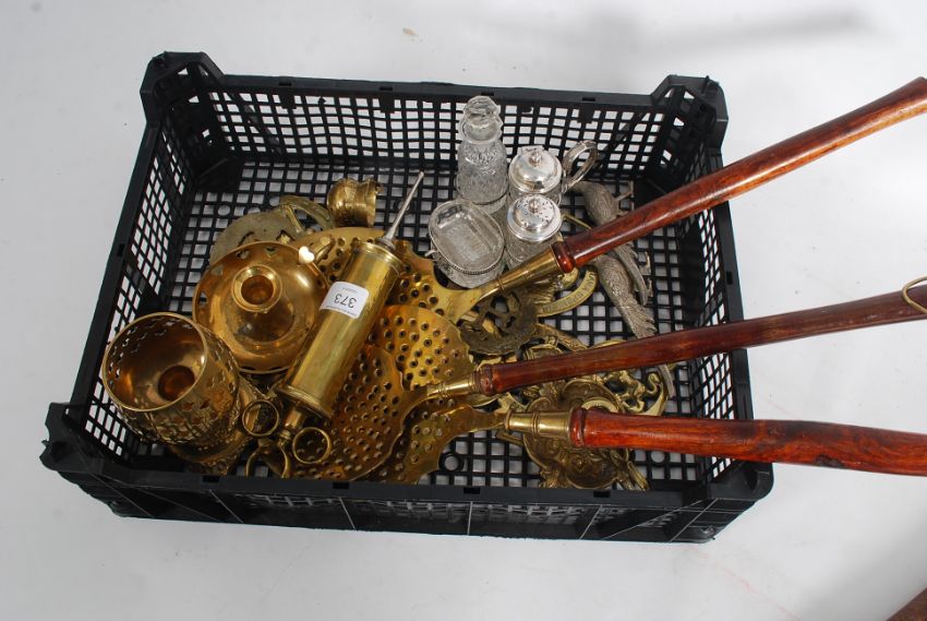 A collection of assorted items (mostly brassware) to include candlestick holder etc, along with white metal topped canisters etc