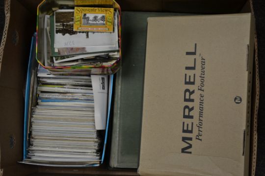 EPHEMERA: Two shoe boxes of postcards, bag of stamps and x2 large mid C20th scrapbooks