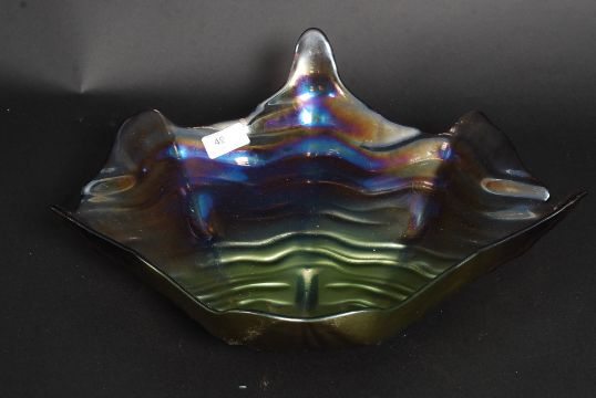 A large early 20th century iridescent carnival glass fruit bowl in the form of a shell. Measures 40cms wide