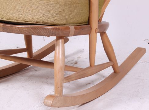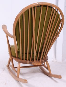 An Ercol beech and elm wood light tall back Windsor country rocking chair / armchair with squab cushions being raised on turned legs with tall spindle back rest. H95cm x W74cm x D79cm