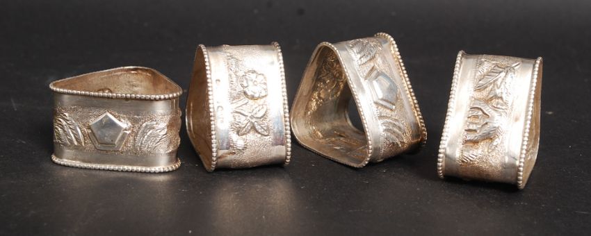 A set of 4 sterling silver marked napkin rings of triangular form raised on relief with elephants and foliage. w 39.5g