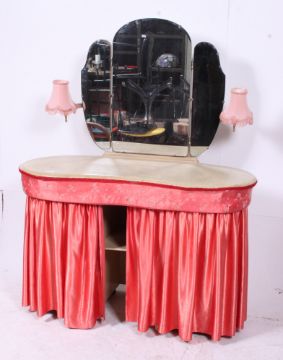 A 1950's retro kidney shaped dressing table having a series of drawers with curtain sides having dressing mirror atop