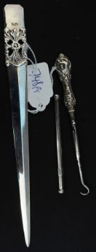A sterling silver cocktail twizzler with metamorphic action together with an Italian silver plate letter knife and a silver hallmarked crochet hook.