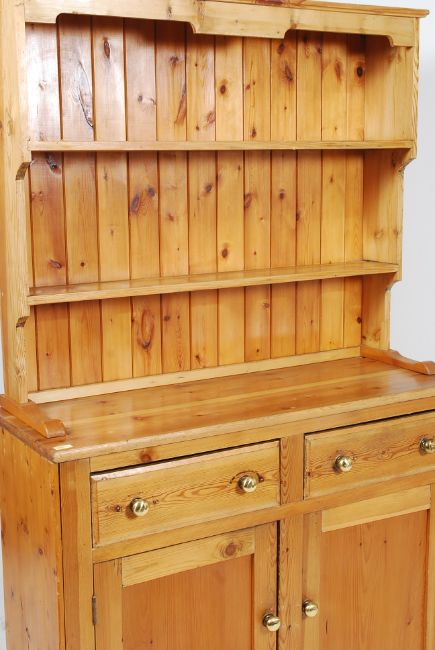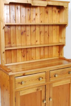 A good quality Pine welsh dresser. The base with cupboards and 2 short drawers having an upright plate rack to the rear. Dismantles to 2 pieces for ease of movement. Measures 192cms high x 124cms wide
