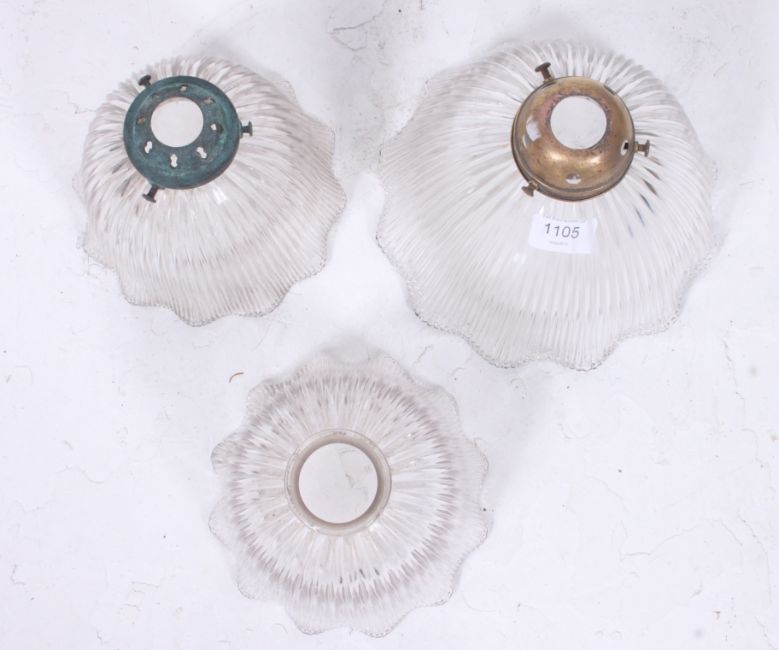 A collection of three 1930's Holophane glass lamp / light shades. Height 17cm