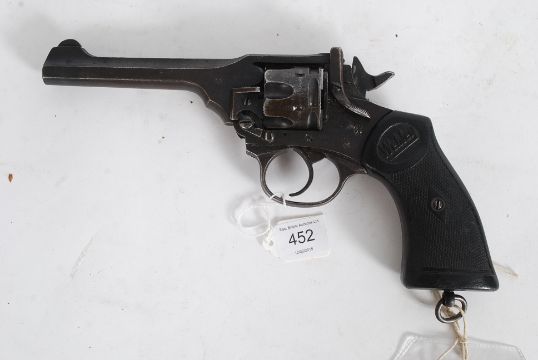 A WW2 British Deactivated Webley Mark IV.38 Pistol revolver stamped WAR FINISH. Chequered grips with curious markings to the gun. Comes with the UK government deactivation certificate 145947
