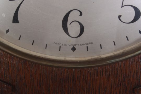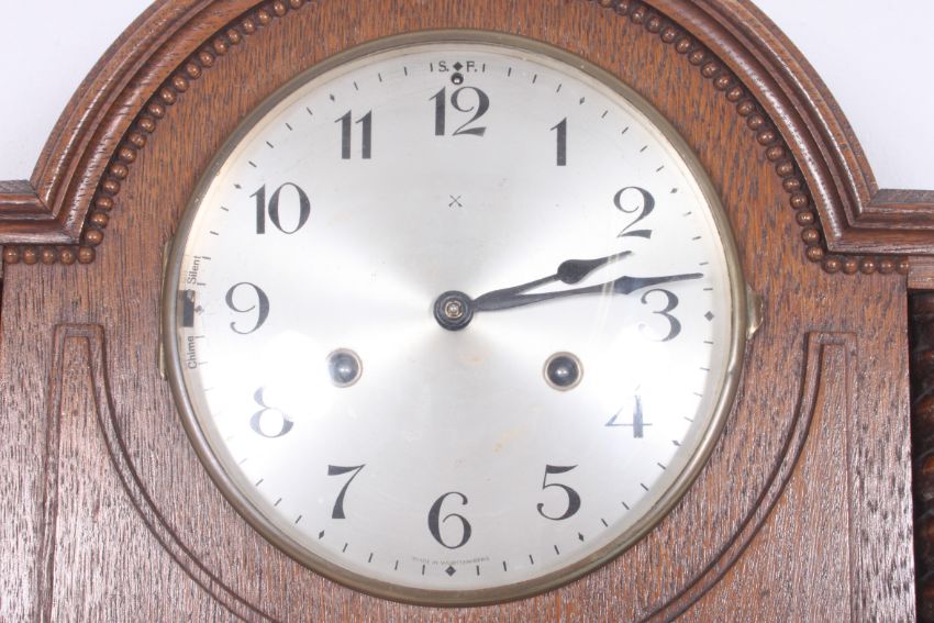 A 1930's Art Deco oak Hamburg & America mantel clock with brass movement, striking on chimes, 8 day movement. H31cm x W44cm x D17cm