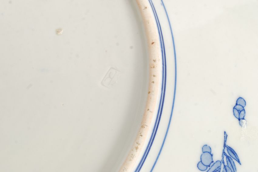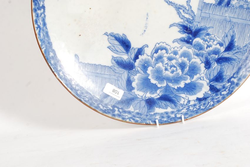 A large Chinese blue and white charger / wall plate having decorative scene with blue banded border having impressed Chinese character marks to rear