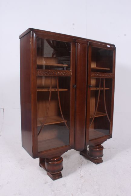 A 1930's Art Deco oak display cabinet raised on unusual feet with twin glazed cabinet above. 123x91x29cm