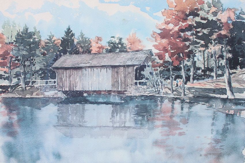 An American New England school Paul N. Noughton watercolour entitled ' old covered bridge' being framed and glazed