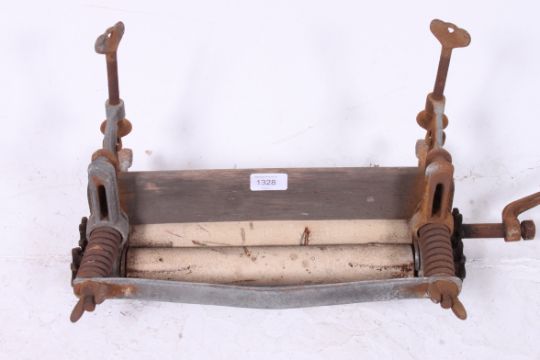 An antique 19th century wooden and cast iron mangle top