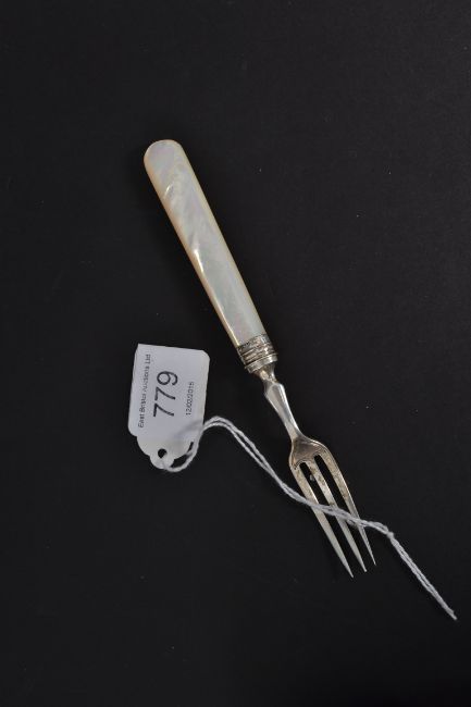 A mother of pearl handled silver hallmarked pickle fork, having Sheffield stamps 1907 by Fredrick C Asman and Co