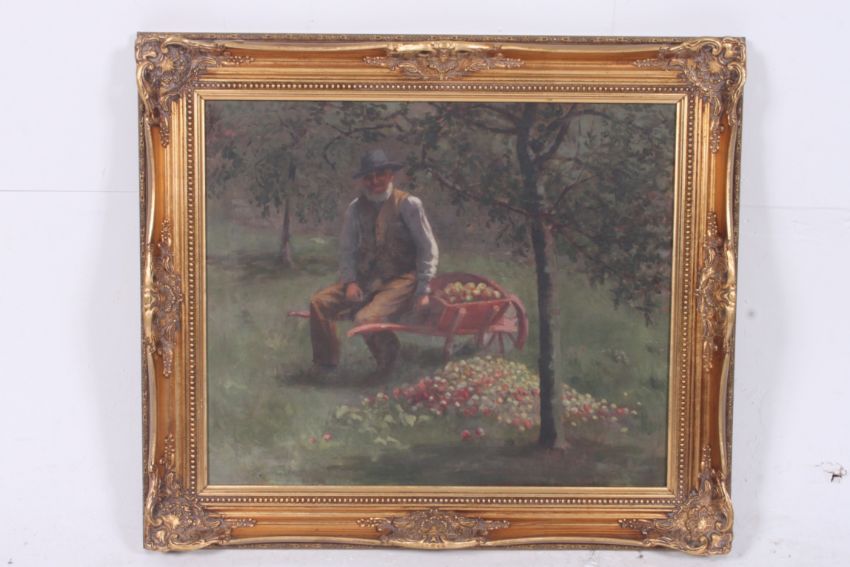 A 20th century oil painting of an elderly apple picker in field. Being gilt framed. 60 x 50