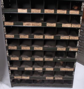 A pair of original mid 20th century Industrial large green enamel metal 72 section cubby cabinets. Each cubby section having painted notation no's etc to sides. Ex Douglas motorcycle factory, Bristol. Both H188cm x W92cm x D32cm