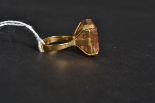 An 18ct gold cushion cut stone cocktail dress ladies ring. The inset oversized stone with inset copper. Raised over bezel mount. Size S, Weight 16.5g