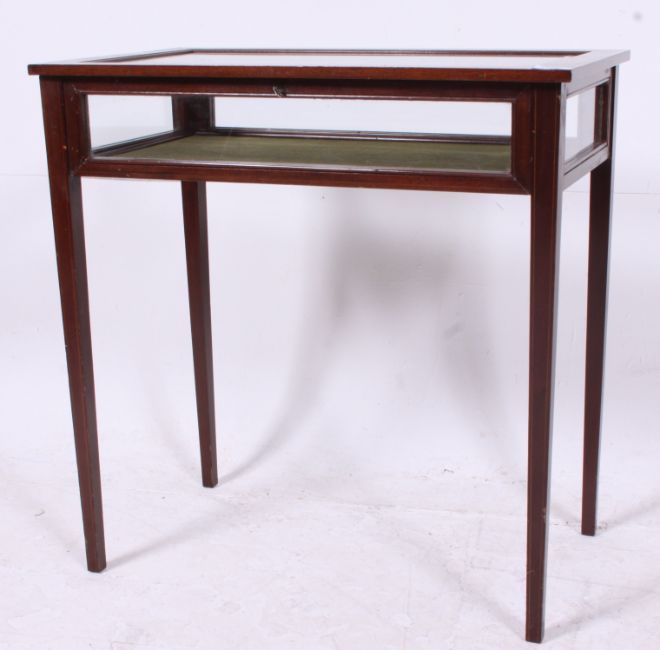 An Edwardian oak cased bijouterie table cabinet being raised on tapered supports having glass top with fall front side door being finished with inlaid banded details. 63x62x38cm