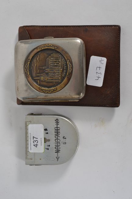 An WWII era second world war German military Original Bezard compass, along with a silver plated 'Dom Zu Koln' bronze plaque cigarette case. The compass in original case, both engraved 'JS, 1937' to rear.
