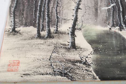 A vintage Chinese Oil On Scroll of Cranes in flight over a snowbound forest and river bearing chinese character marks to the base