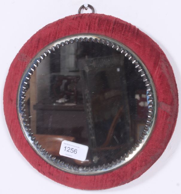 A 19th century velour upholstered circular gypsy mirror. The red velour border with mirror to centre. 26cm diam