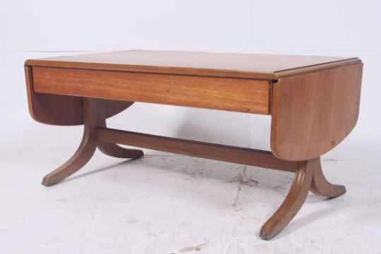 A 1970's retro Nathan drop leaf sofa style coffee occasional table raised on sabre style supports with drop leaves either end of the rectangular top. H44cm x W142cm x D53cm