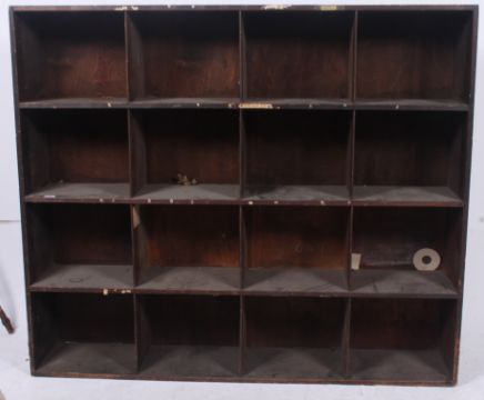 A large vintage early 20th century wooden panelled Industrial pigeon hole storage cabinet, ex Douglas Motorcycle factory, Bristol. H130cm x W92cm x D31cm