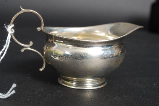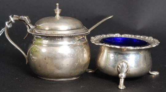 A silver hallmarked creamer by Joseph Gloster, Birmingham 1906 weight 35.8g. Together with a Joseph Gloster mustard pot with lid for Birmingham 1935? , weight 66.3g Also a rococo silver hallmarked salt with blue glass liner, Birmingham ( marks partially legible) 34.7g exc liner and also a
