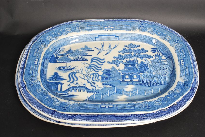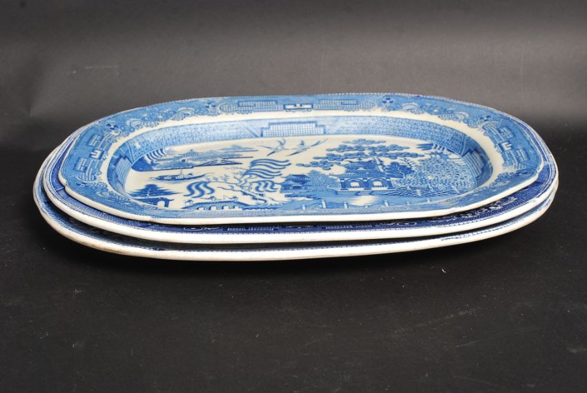 Three 19th century blue and white willow pattern meat platters.
