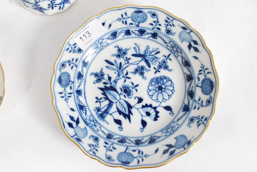 A 19th century blue and white Meissen china trio. The blue and white design of oriental form having crossed swords mark to the base
