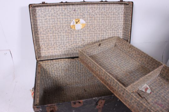 A large 20th century vintage steamer trunk in black having hinged clasps together with another
