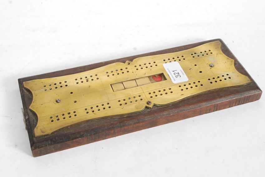 A good 19th century oak and brass crib / cribbage board having a suit sliding panel to centre for Hears, Diamonds, Clubs & Spades