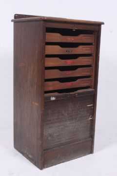 A 1950's pedestal oak tambour office filing cabinet with tambour front, drawers to inside (no lock). H94cm x W49cm x D41cm