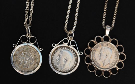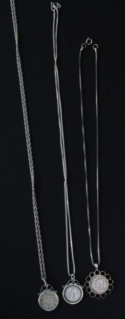 A collection of three white metal (stamped 925, indicating silver content ) mounted coins necklaces. Weight 19,5g.
