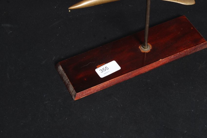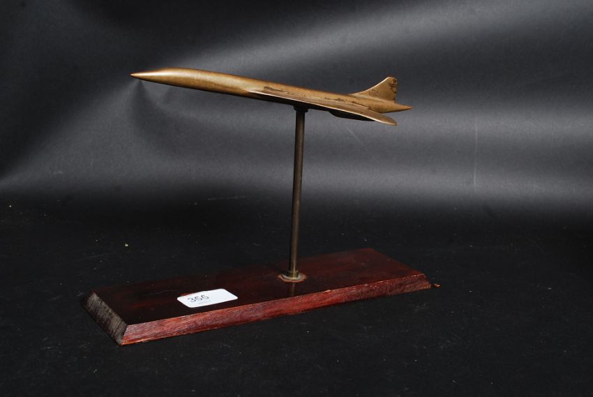 A 1960's apprentice piece brass sculpture of Concorde raised over mahogany plinth base